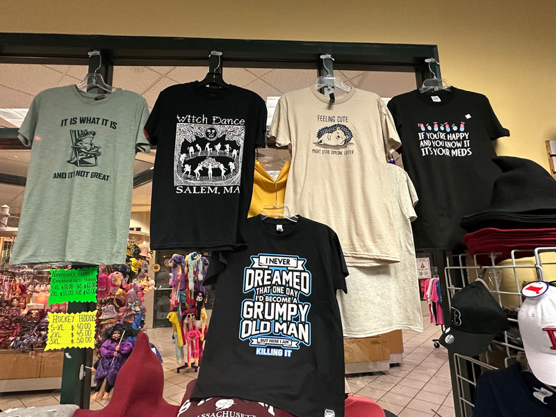 Our secret potion? Over 40 original designs that blend Salem's mystique with a hefty dose of humor. Think crowd-pleasers like the cheeky "Bite Me," the celebratory "Girls Night Out," and the adventure-ready "Road Trip" (inspired by those unforgettable pandemic journeys!). These aren't just designs; they're conversation starters, cherished souvenirs, and the reason folks from around the world make Witch Tees a traditional stop on their Salem adventures, year after year. And now we invite you to our physical store. Step inside, and you'll find even more! We have a large variety of tees, sweatshirts, souvenirs and the like celebrating everything from classic witch themes, Mountain and historic Salem to local Boston sports teams and a large array of hilarious tees like “Sorry I’m late, I didn’t want to come” to “My body is a temple: ancient, crumbling and probably cursed or haunted". Plus, we've got a delightful array of unique gifts and souvenirs, from tote bags and mugs to magnets and, yes, even the perfect witch hat. Come on down – your Salem style adventure awaits